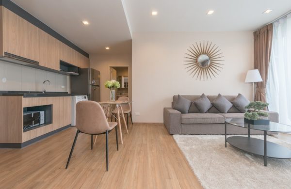 with a seating area and a kitchen.